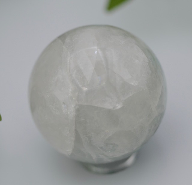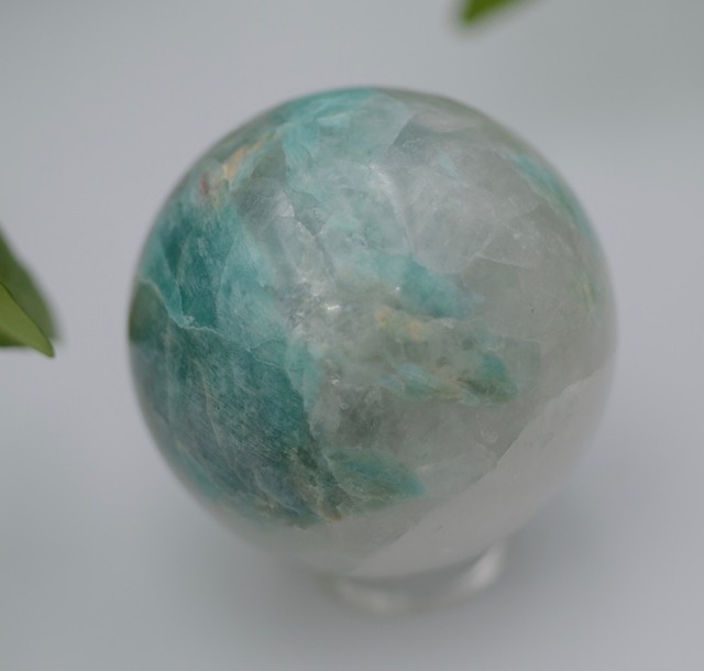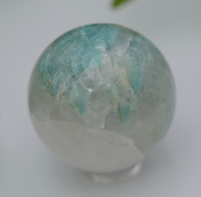 表面積のかなりの部分(6割くらいでしょうか)が半透明のクリスタルでできた珍しい丸玉です。アマゾナイトとクォーツの共生したタイプといっていいかと思います。