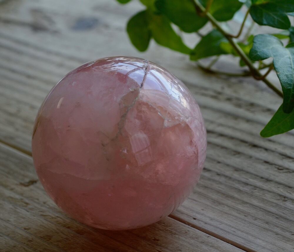 裂け目ともいえるような大きなクラックがあります。こういった一見「傷物」は普段は仕入れないのですが、この一点に関しては一度手にした瞬間からハートに何かかけがねがかかったような衝撃があって、可愛くてしょうがないと思い、どうしても連れて帰りたいと思ったローズクォーツです。そして当店で初めて仕入れたローズクォーツの丸玉です。