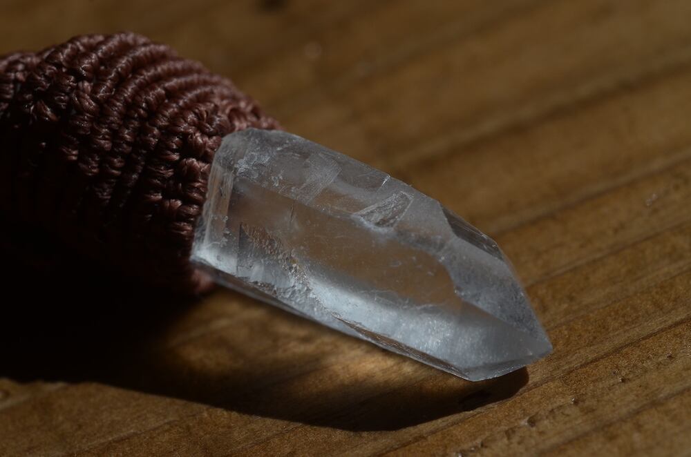 サイドに別の水晶がくっついて育ったと思われる剥離痕、しっかりとした根元部分にぐるぐる巻きにされた糸もドングリのようで愛らしいです。